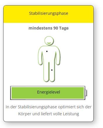 Die proteinhaltige Aktivierungsphase wandelt sich im Verlauf schrittweise durch immer mehr Grüne Tage zu einer sehr ausgewogenen Ernährungsweise, welche in der Stabilisierungsphase weitere 90 Tage fortgesetzt wird. Diese Phase dient dazu, den Körper dauerhaft in seinem ausgeglichenen Zustand zu halten und die veränderte Ernährung zur guten Gewohnheit werden zu lassen.