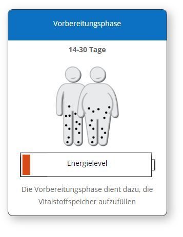dauert zwischen 2 und 4 Wochen. Der Körper wird spielend leicht vorbereitet mit leckeren Getränken, ohne die jetzigen Ernährungsgewohnheiten zu verändern. Dabei wird das Immunsystem gestärkt und eine „Grundreinigung“ schon eingeleitet. Viele Prozesse im Körper werden aufgrund der optimalen Mikronährstoffe, welche gleichzeitig in die Zellen kommen, deutlich und spürbar verbessert. Viele erleben hier schon mehr Energie, eine traumhafte Regeneration, besseren Stuhlgang, ein kräftigeres Immunsystem u.v.m.